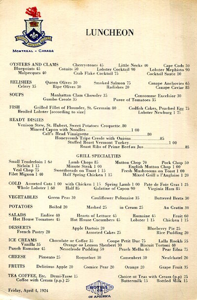 Canada Montreal Mount Royal Hotel Menu 1924-2