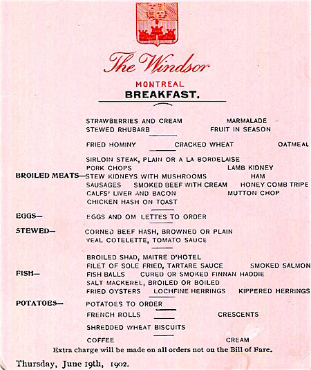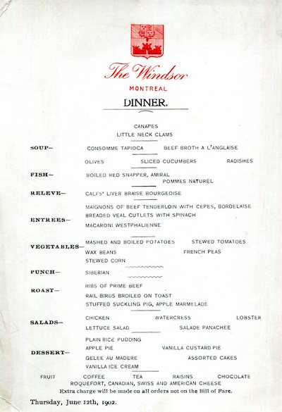 Canada Montreal Windsor Hotel Menu 1902-2