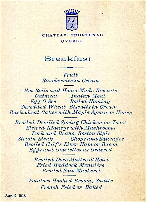 Canada Quebec Chateau Frontenac Menu 1927 Front