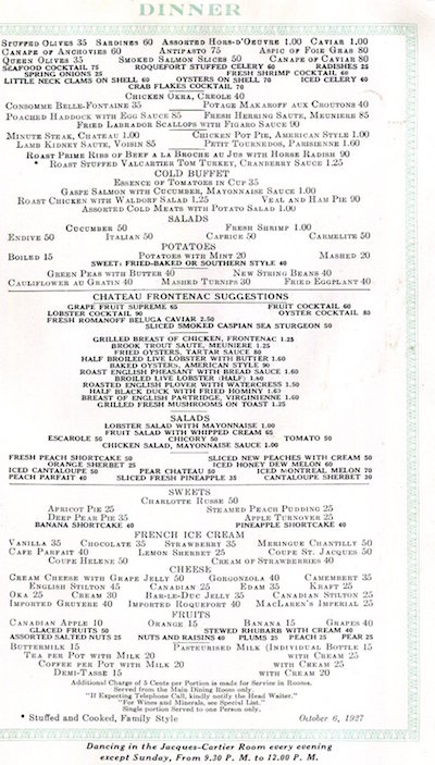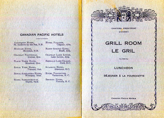 Canada Quebec Chateau Frontenac Menu 1927 Inside