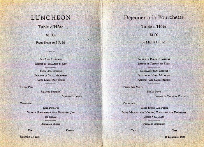 Canada Quebec Chateau Frontenac Menu 1929 Inside
