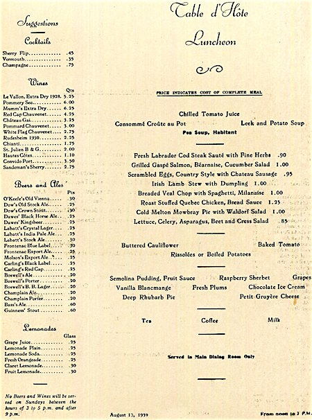 Canada Quebec Chateau Frontenac Menu 1939-2 Front