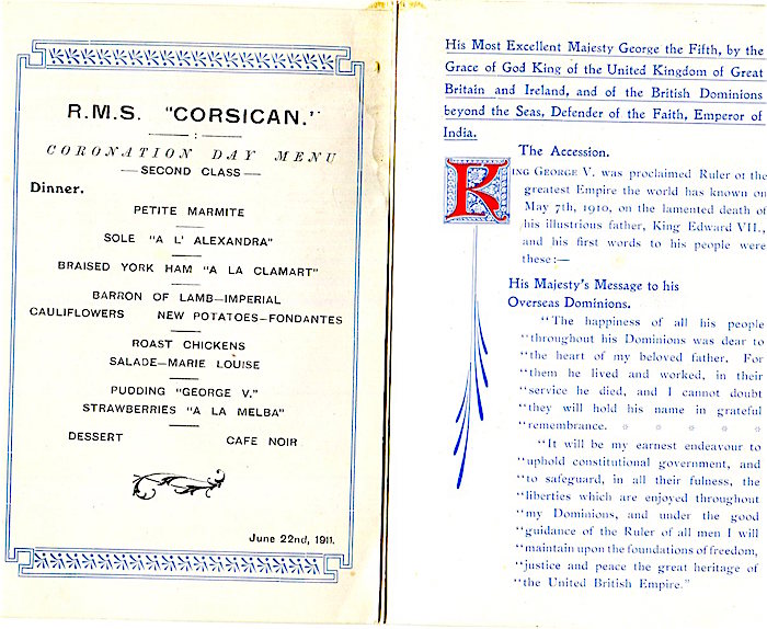 Canada Transport Steamship Allan Line Corsican Menu Coronation Day 1911 Inside