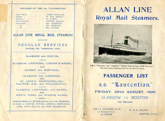 Canada Transport Steamship Allan Line Laurentian Passenger List 1909 Front