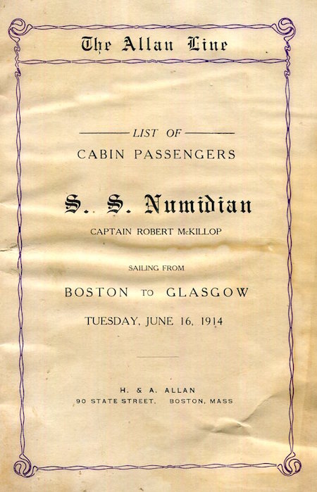 Canada Transport Steamship Allan Line Numidian Passenger List 1914 Front