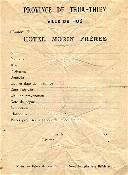 Cambodia Hotel Guest Form Morin Freres Thua 1938