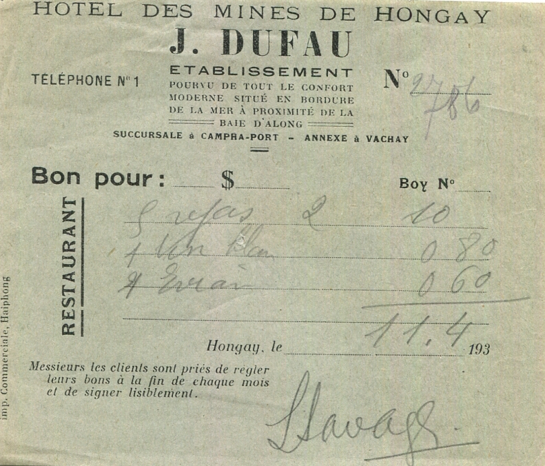 Cambodia Hotel Receipt Hon Gai Des Mines 1938