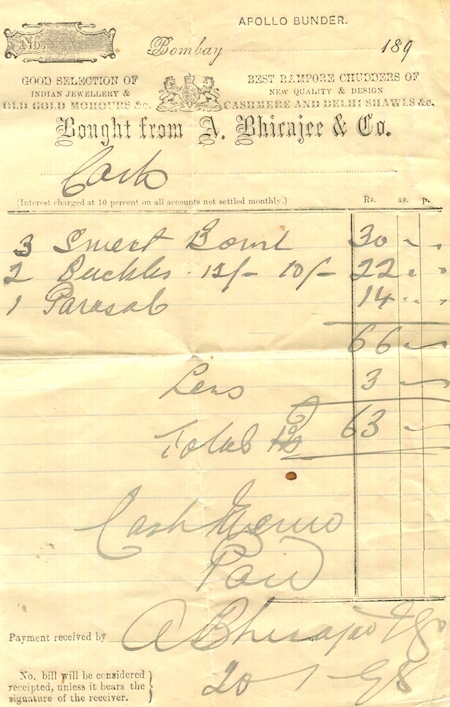 India Bombay Commerce A Bhierajee Co Receipt 1898