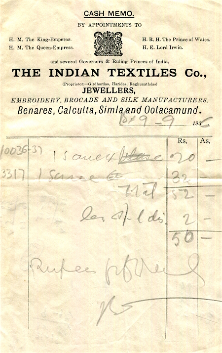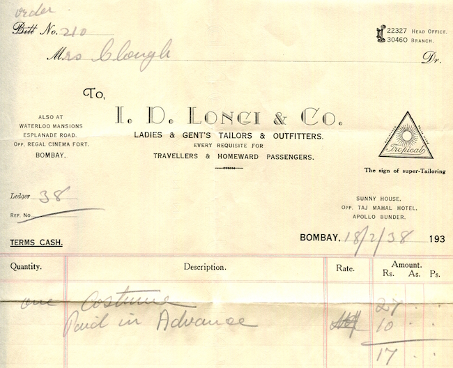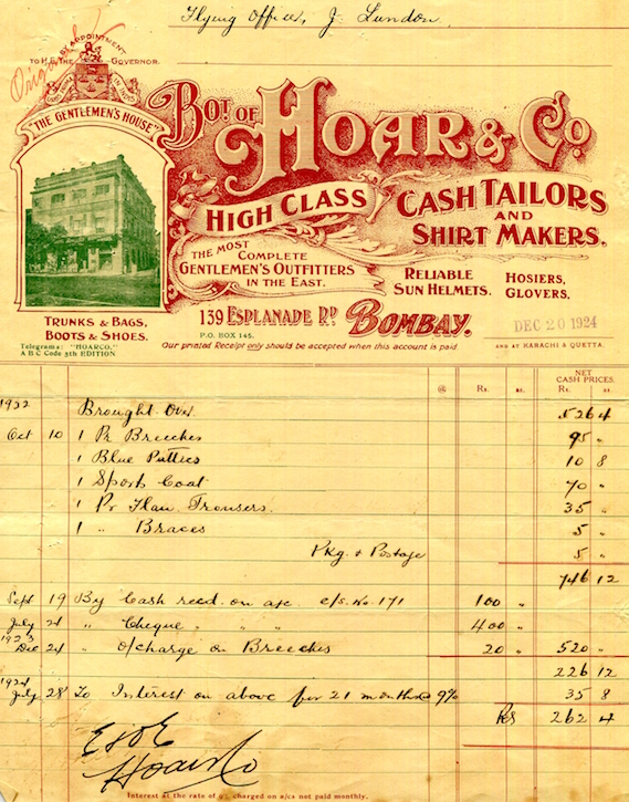 India Bombay Commerce Hoar Co Tailors Receipt 1924