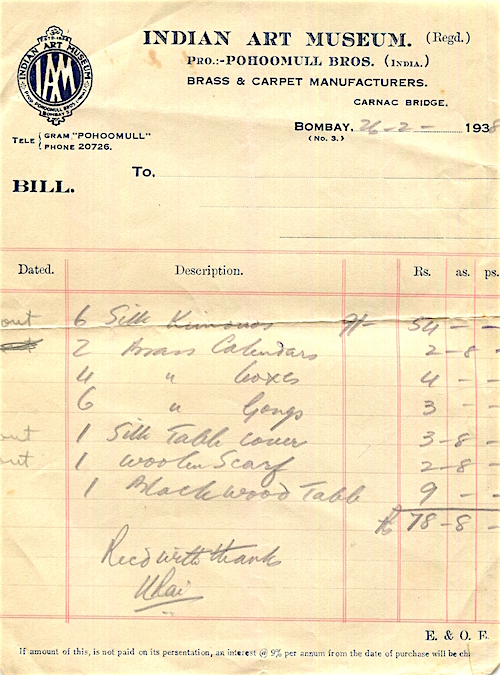India Bombay Commerce Indidan Art Museum Receipt 1938