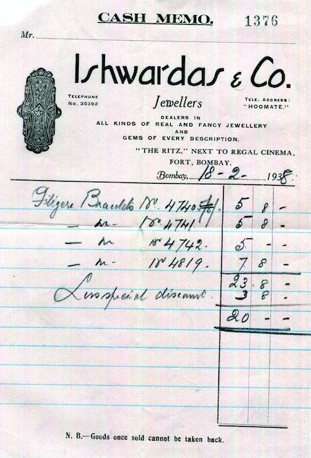 India Bombay Commerce Newman Co Receipt 1936 Back