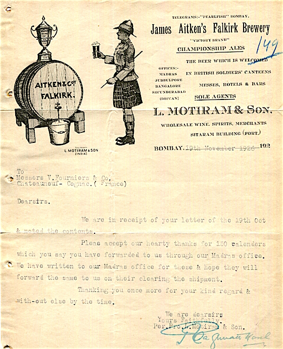India Bombay Commerce James Aitkens Falkrirk Brewery Letter 1926