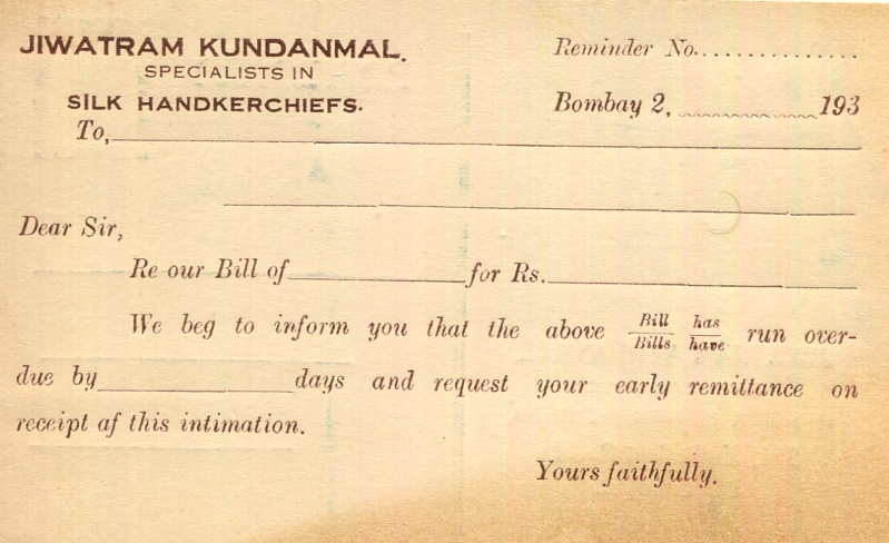 India Bombay Commerce Jiwatram Kundanmal Postcard 1935