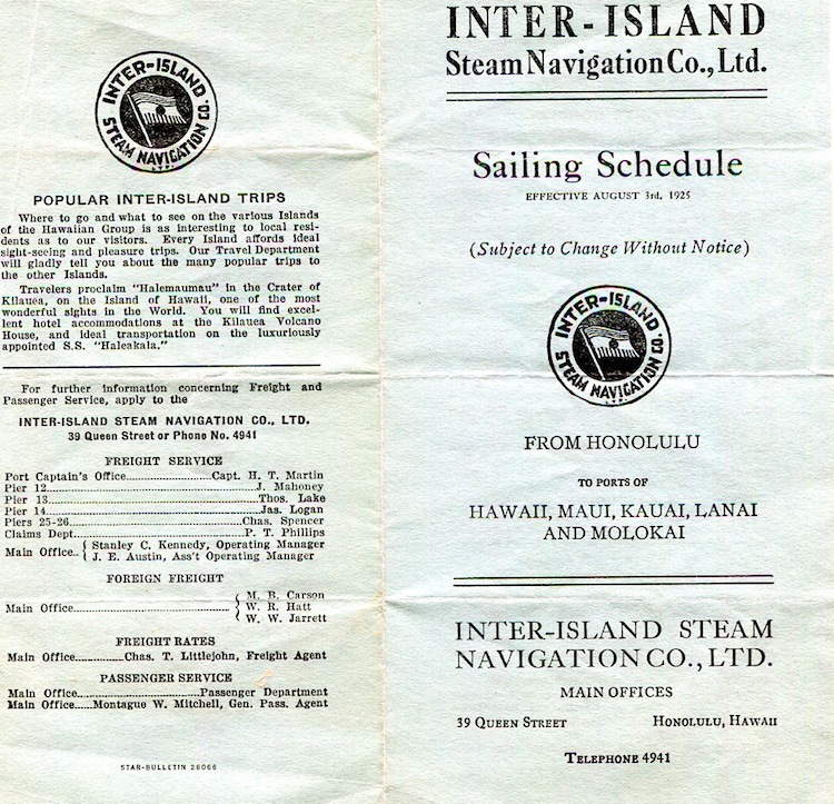 Hawaii Transport Steamship Inter-Island Steam Navigation Leaflet 1921-1
