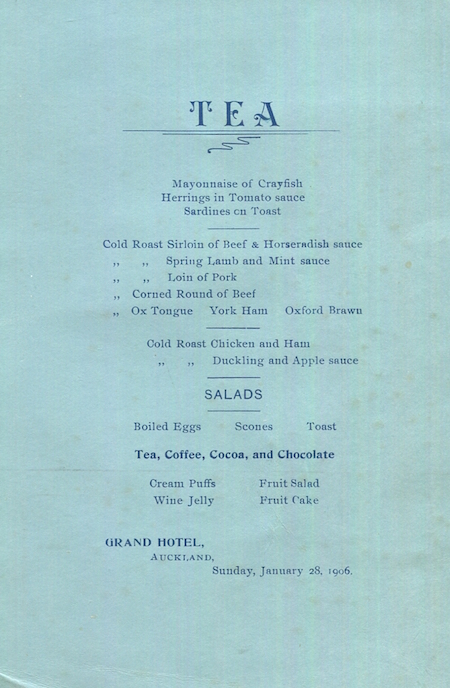 New Zealand Auckland Hotel Grand Hotel Tea Menu 1906
