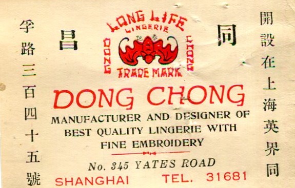 Shanghai Commerce Business Card Dong Chong Lingerie 1934 Front