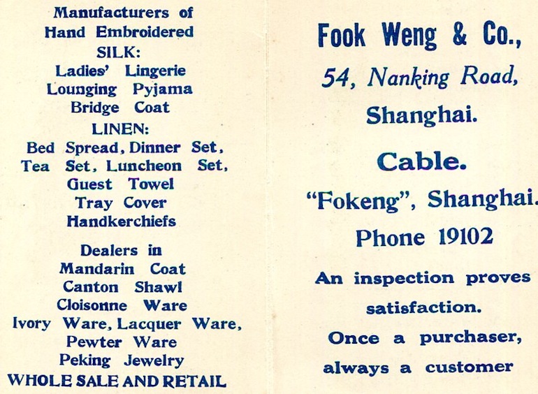 Shanghai Commerce Business Card Fook Weng & Co Shop 1930 Front