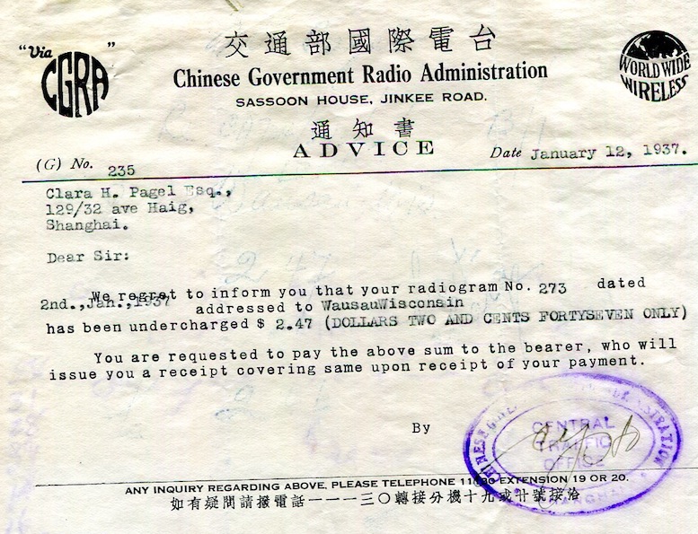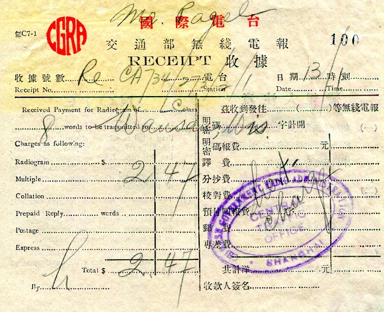 Shanghai Commerce Chinese Government Radio Administration Receipt 1937-1