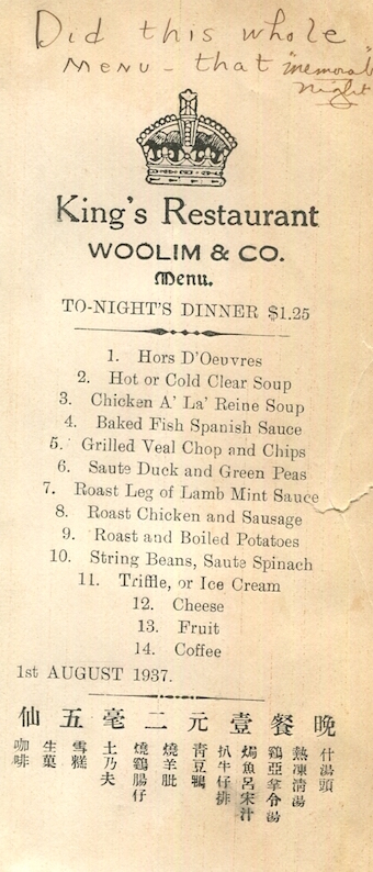 Hong Kong Restaurant Kings Menu 1937