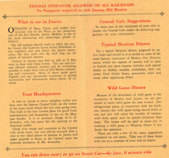 Mexico Juarez Restaurant Central Cafe Brochure 1930 Front
