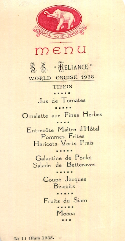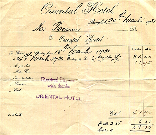 Siam Bangkok Hotel Oriental Menu Receipt 1931
