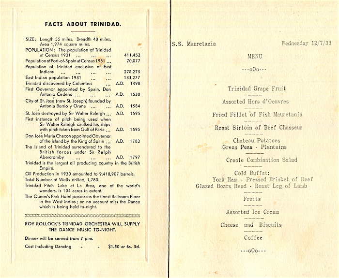 Trinidad And Tobago Port Of Spain Hotel Queens Park Menu 1933 Inside