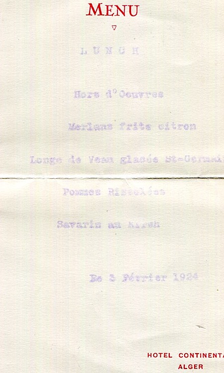 Algeria Algiers Hotel Continental Menu 1927 Back