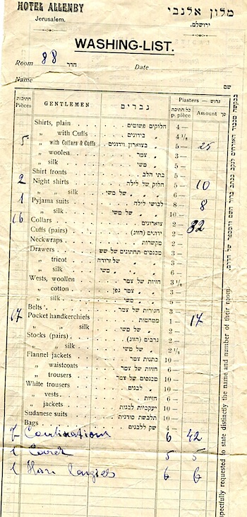 Palestine Jerusalem Allenby Hotel Laundry List Receipt 1924