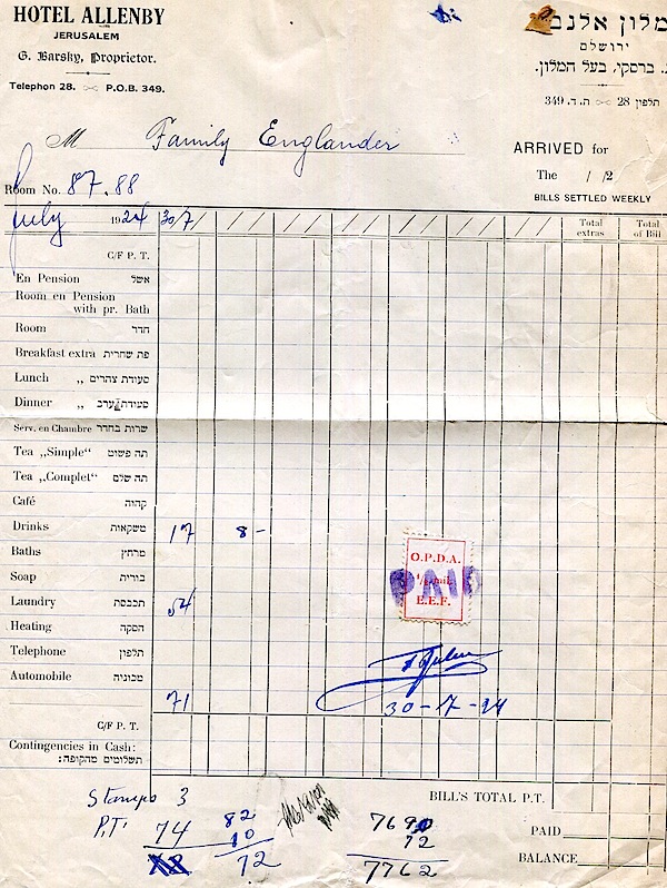 Palestine Jerusalem Allenby Hotel Receipt 1924-1