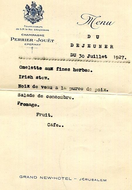 Palestine Jerusalem Grand New Hotel Hotel Menu 1927
