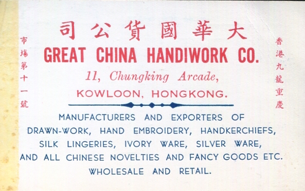 Hong Kong Commerce Great China Handiwork Co Business Card 1935