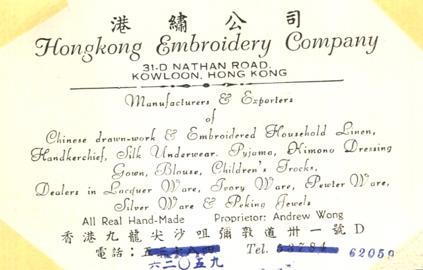 Hong Kong Commerce Hwamer Co Business Card Emroideries 1922
