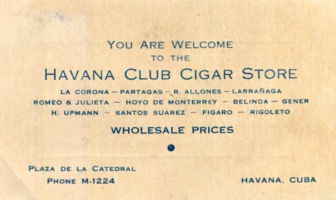 Cuba Commerce Havana Club Cigar Store Business Card 1938