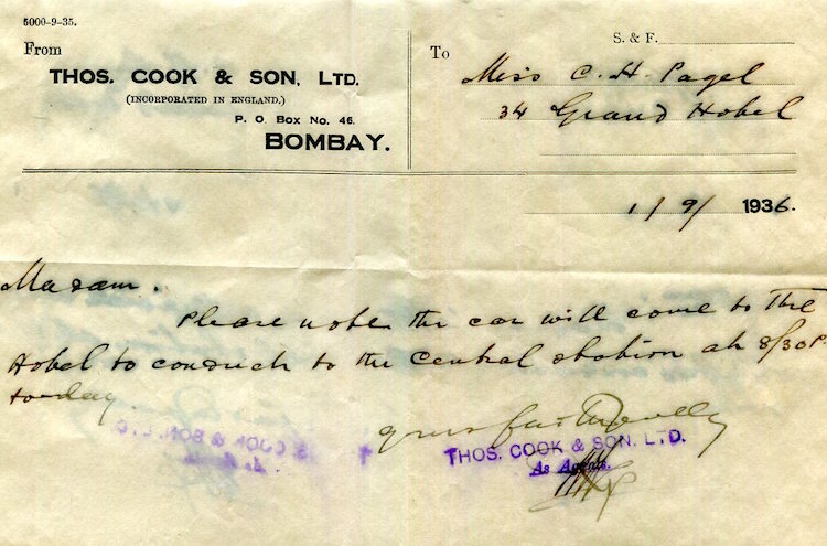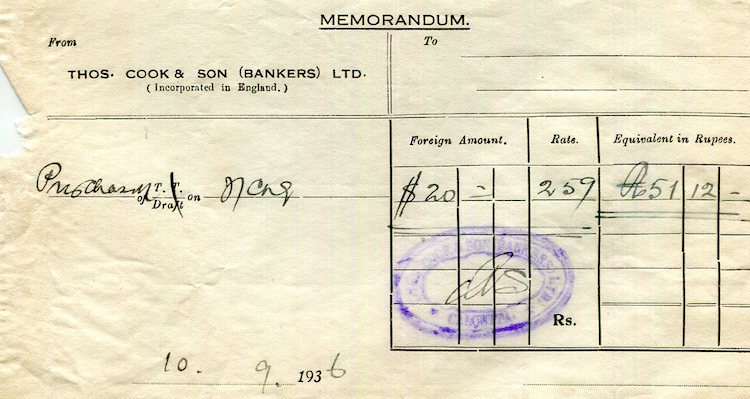 Travel Agency Thomas Cook Bombay Office Receipt 1936-2