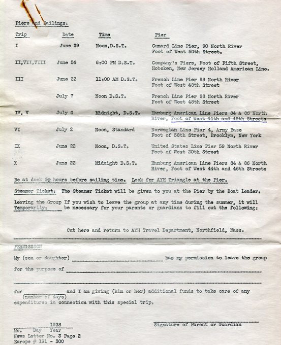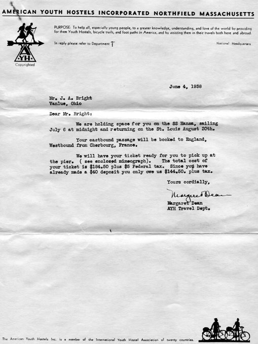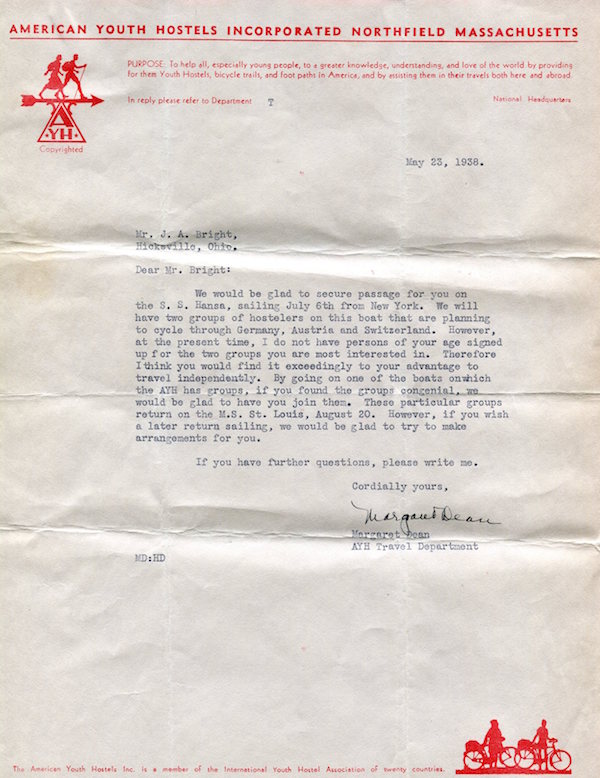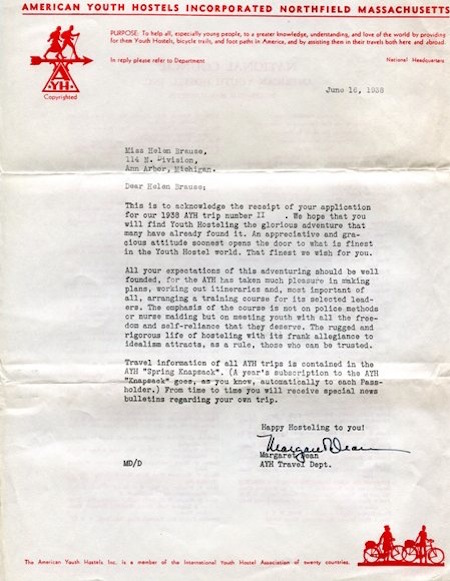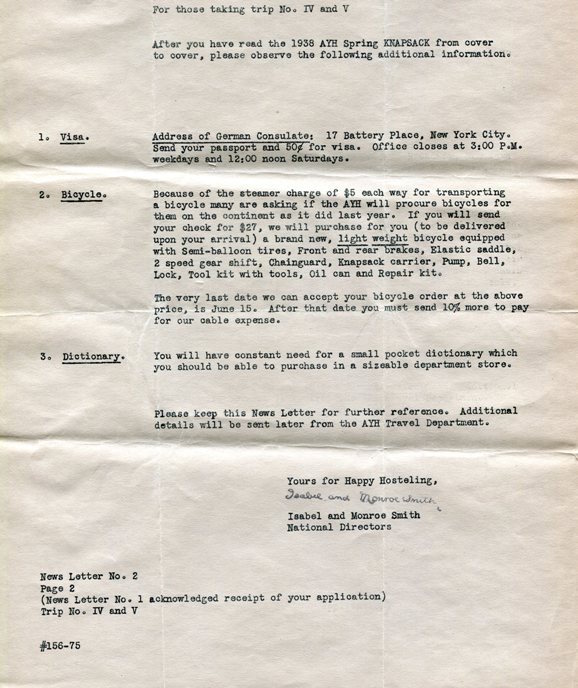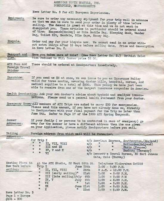 United States Travel Agency AYH Itinerary 1938 Letter No. 3