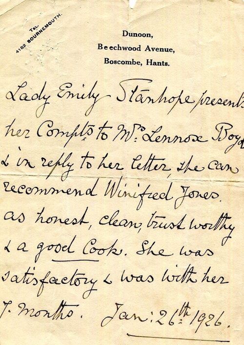 England Commerce Boscombe Letter Of Recommendation For Cook Lady Emily Stanhope 1926