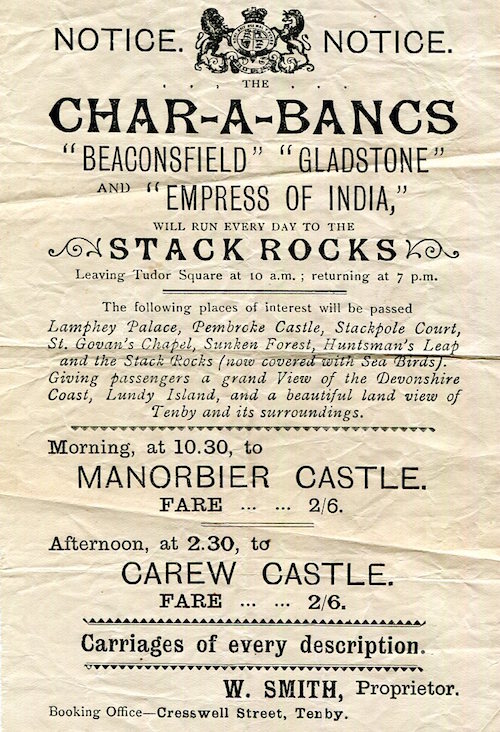 England Commerce Tenby Sightseeing Carriages Leaflet Stack Rocks Manorbier Castle Carew Castle 1912