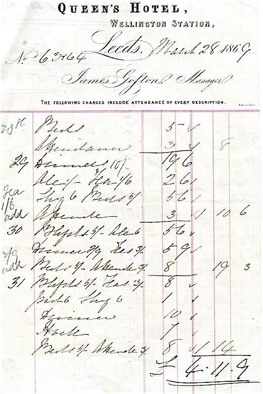England Leeds Quenns Hotel Built 1863 Receipt 1869