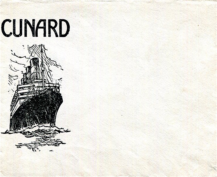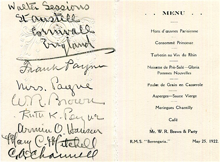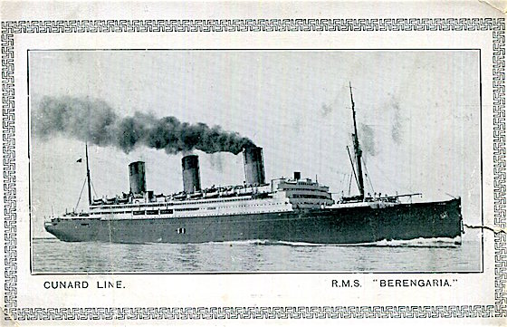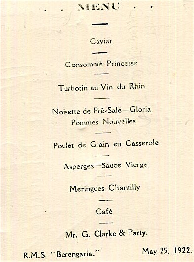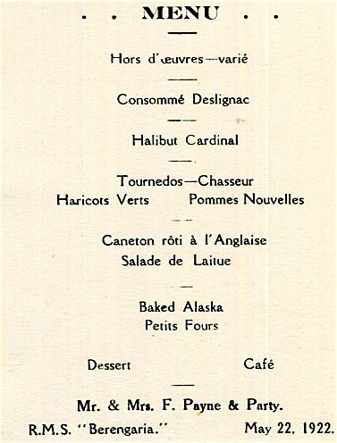 England Transport Steamship Cunard Line SS Berengaria Menu 1922-2 Front