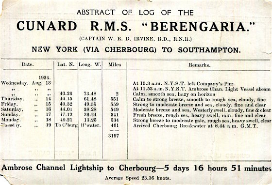 England Transport Steamship Cunard Line SS Berengaria Log 1924 Back