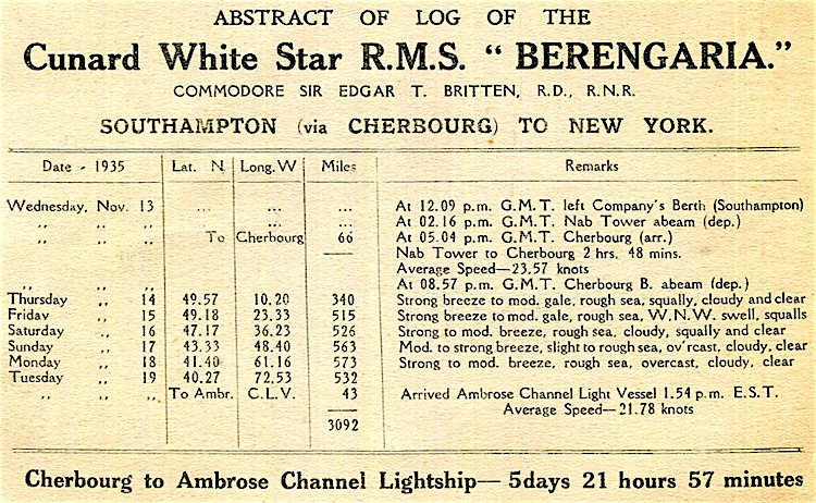 England Transport Steamship Cunard Line SS Berengaria Log 1935 Back