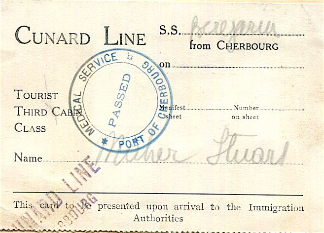England Transport Steamship Cunard Line SS Berengaria Medical Card For Immigration 1927