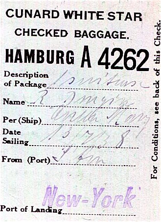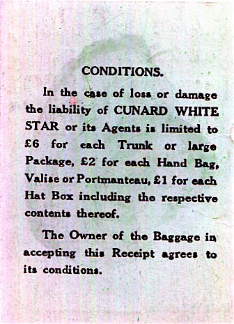 England Transport Steamship Cunard Line Baggage Check 1938 Back