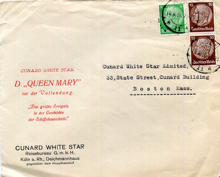 England Transport Steamships Cunard Line SS Queen Mary Advertising Envelope Cologne 1936