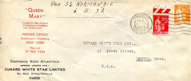 England Transport Steamships Cunard Line SS Queen Mary Advertising Envelope Paris 1936