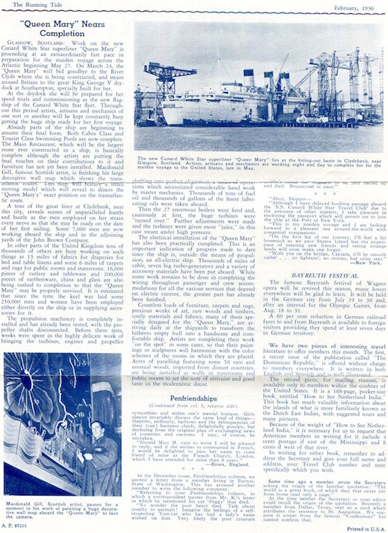 England Transport Steamships Cunard Line SS Queen Mary Advertising Leaflet Running Tide 1936 Back