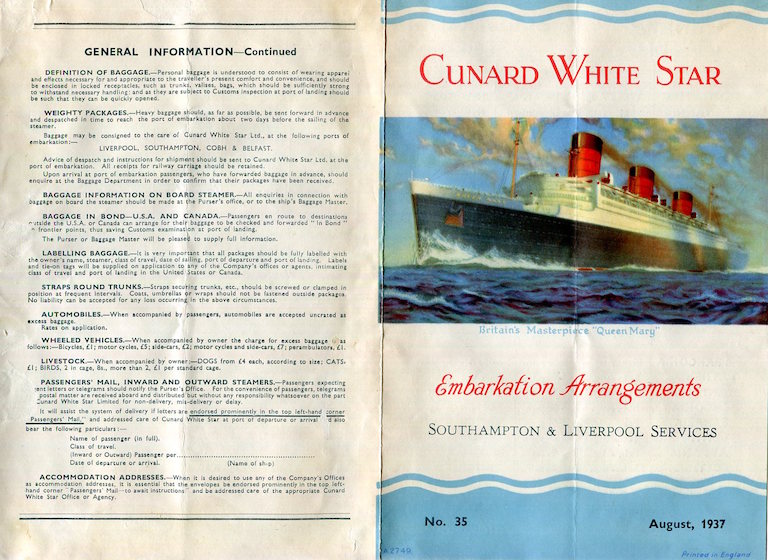 England Transport Steamships Cunard Line SS Queen Mary Brochure Embarkations 1937 Front