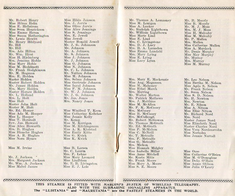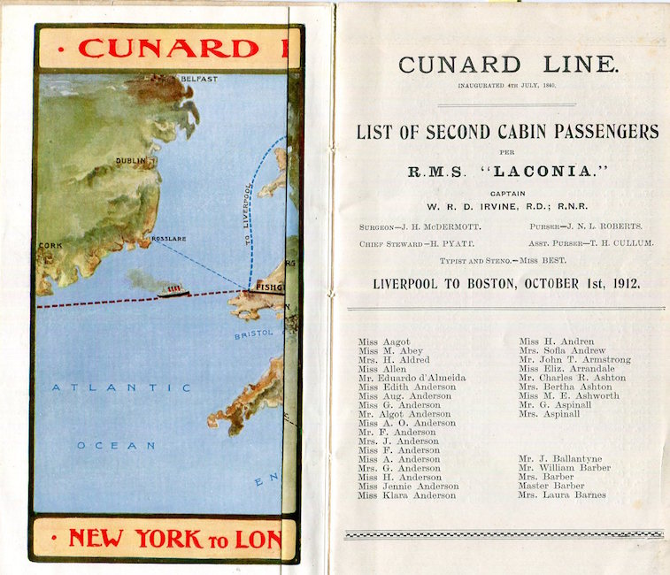 England Transport Steamship Cunard Line SS Laconia Passenger List 1912 Inside 2