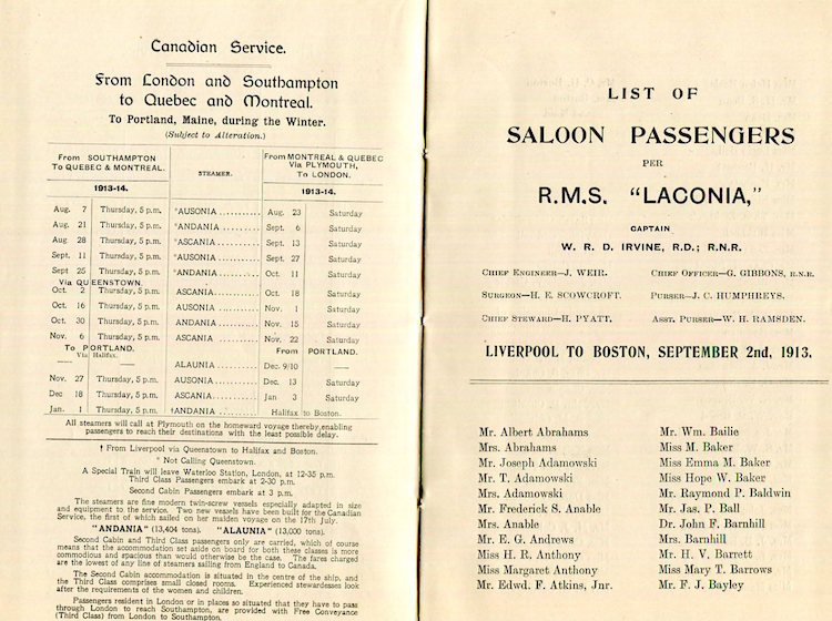 England Transport Steamship Cunard Line SS Laconia Passenger List 1913 Inside 1