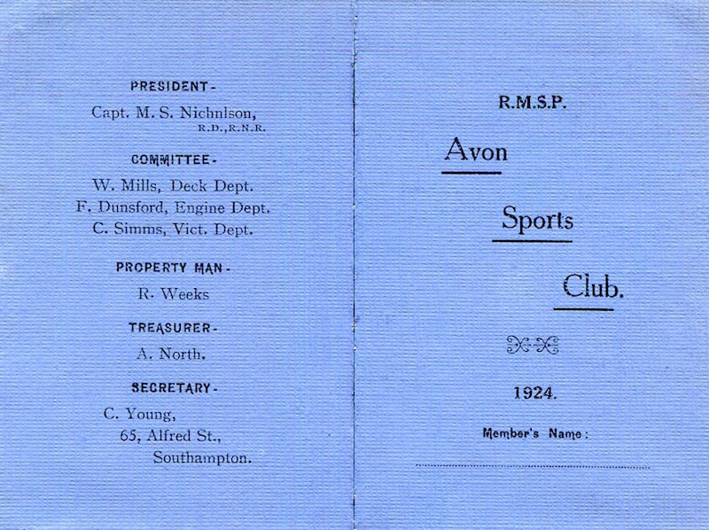 England Transport Steamship Royal Mail Line Avon Sports Club Membership 1924 Front
